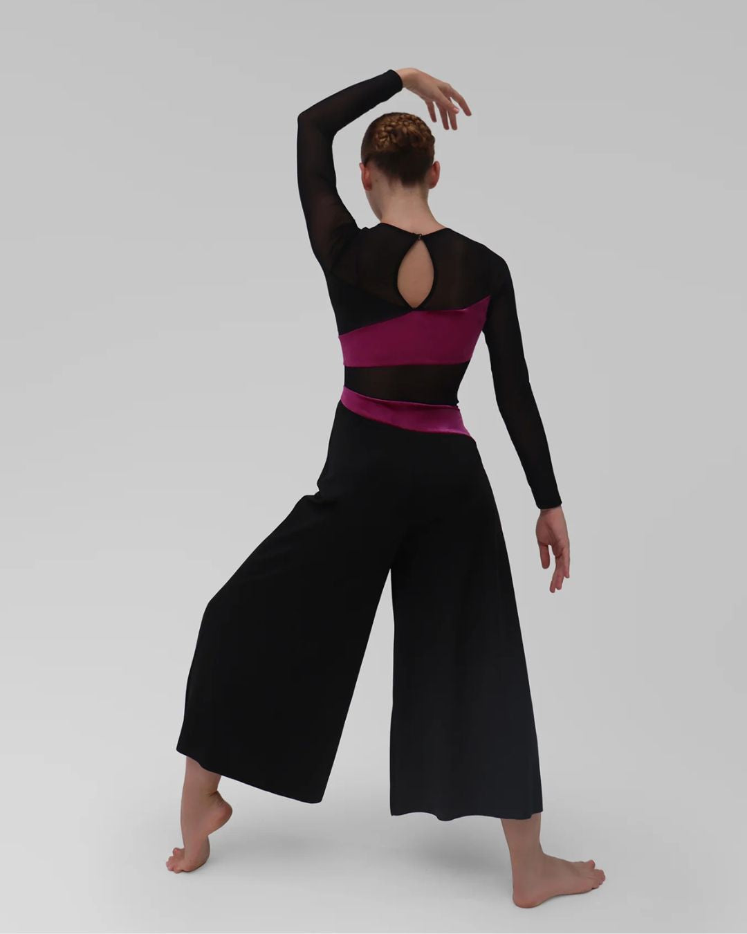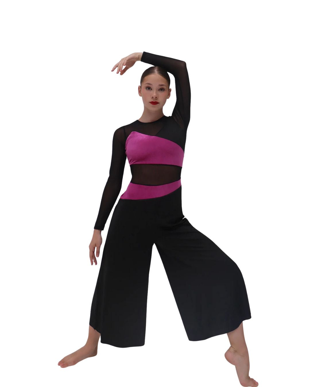 I morbidi pannelli in velluto magenta sono uniti a lycra nera e inserti in rete elasticizzata, per creare un completo pantalone a gamba larga, adatto a diversi generi di danza.