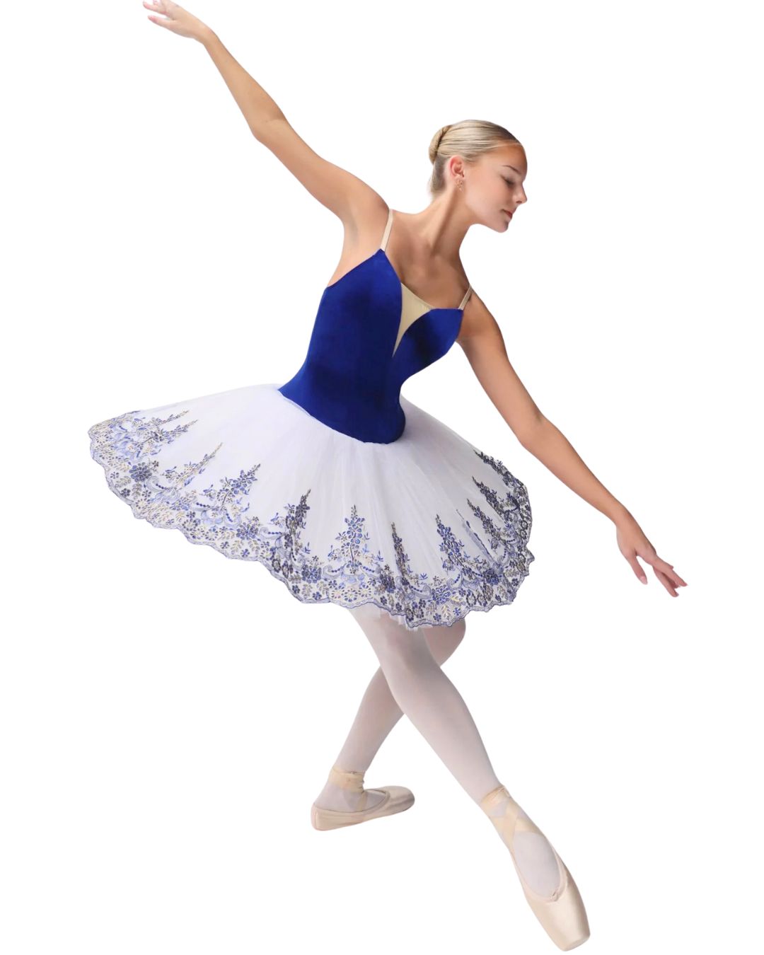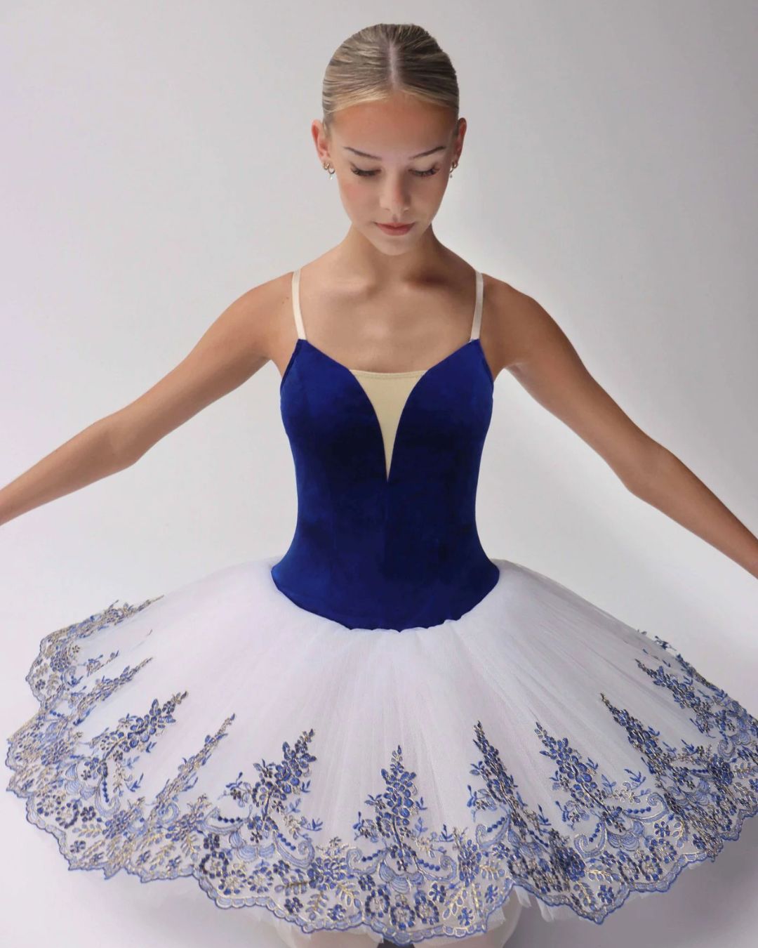 Un costume che unisce costruzione tecnica, resa visiva e affidabilità nel tempo: una scelta strategica per elevare il livello percepito dello spettacolo e garantire un’immagine coerente e professionale sul palcoscenico. Un tutù di alta gamma, ha un corpetto in velluto blu royal e un piatto bianco candido. Lo strato superiore è impreziosito da ricami di qualità e poggia su uno strato di tulle perfettamente plissettato.