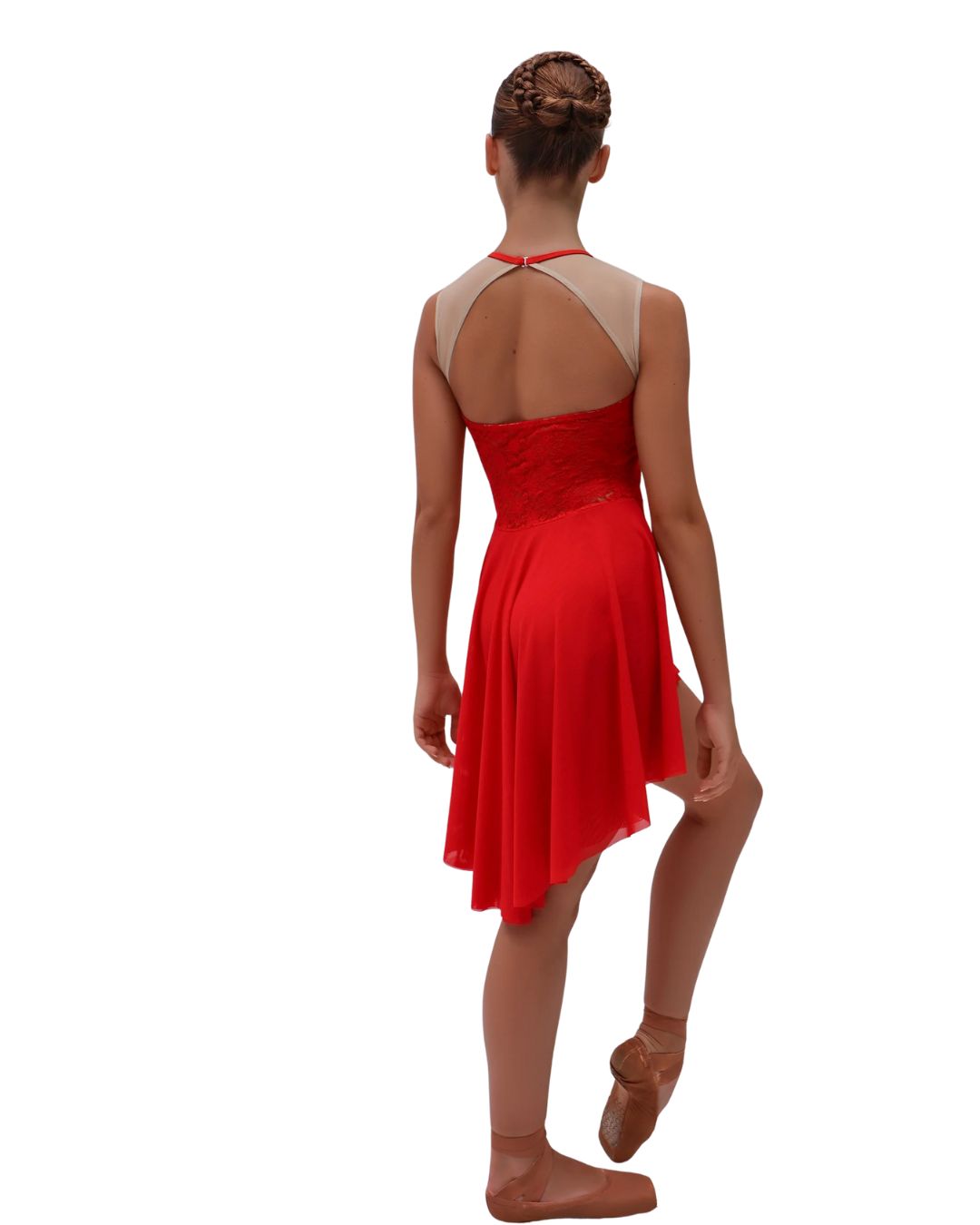 Un classico modello lirico, adatto a tutte le età. Il grazioso corpetto a cuore in pizzo elasticizzato rosso su lycra è impreziosito da un bordo rosso. La gonna a ruota in rete, dal fascino sognante, si allunga gradualmente da una lunghezza più corta sul davanti fino a poco sotto il ginocchio sul retro.