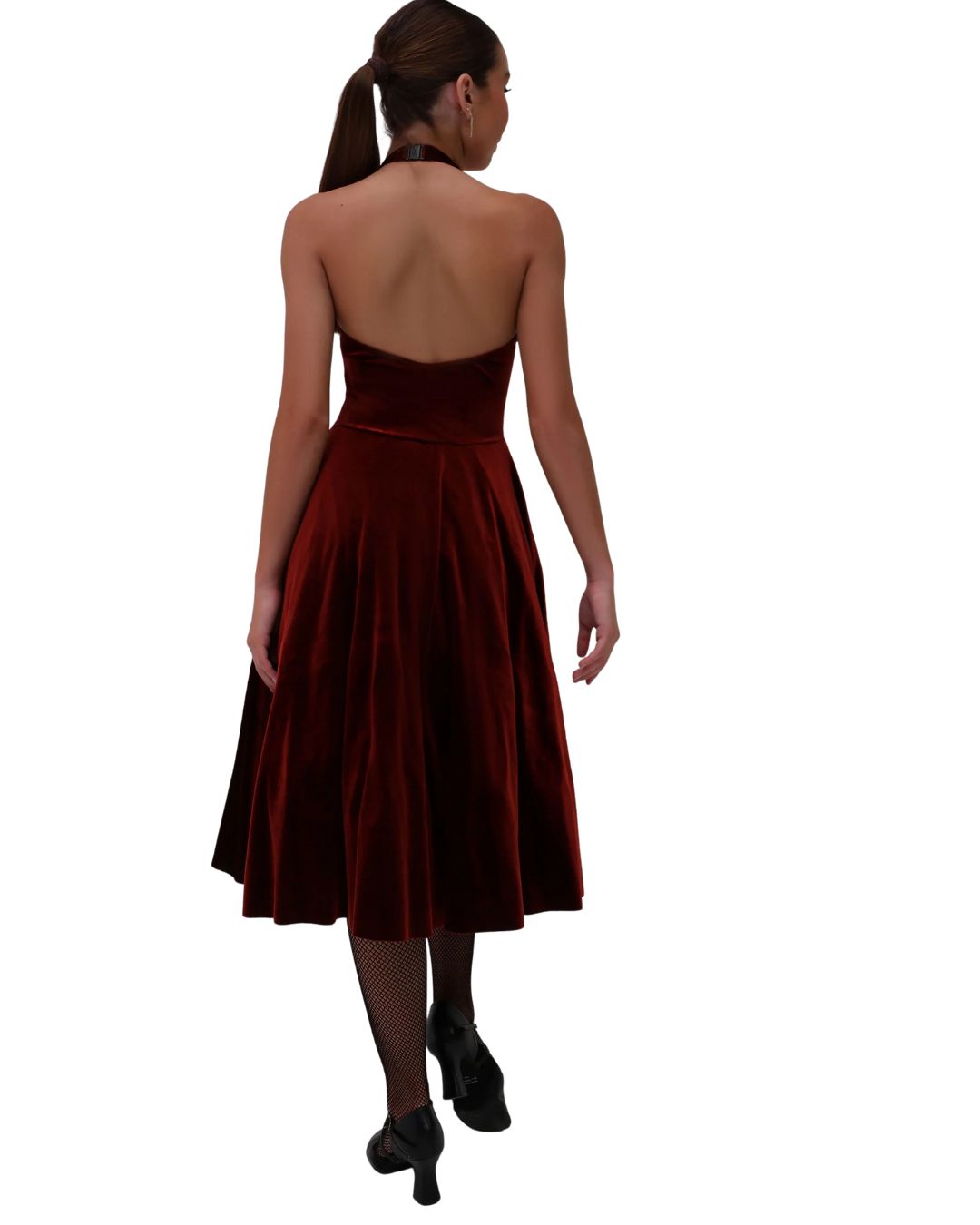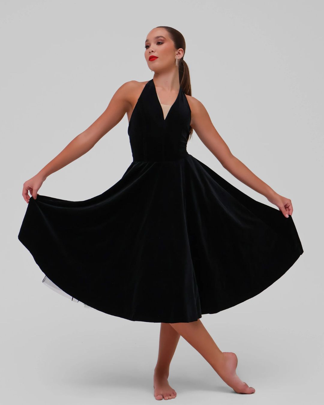 Progettato con un corpetto aderente con cuciture e bordatura, una gonna a ruota con strato superiore e sottogonne morbide in rete con volant. E’ un sofisticato abito con scollo all'americana per spettacoli di Broadway, musical e modern.